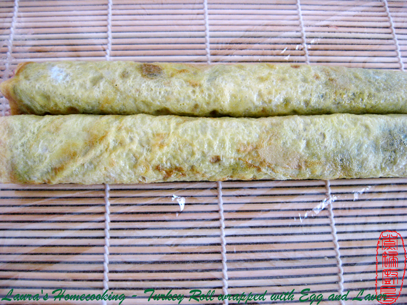 2. Add some corn starch to turkey, mix well. It don't have to be corn starch, can be any type of starch. 3. Beat eggs well, add a little bit cooking wine, mix well. 4. Heat up the frying pan, add a little bit of cooking oil, then adjust the heat to low. 5. Add some beaten egg to pan, shape it to a thin sheet, fry until golden brown. Set aside to let it cool. Make as many as you need, but make sure you have some beanten egg left. 6. Cut egg sheet or laver sheet if needed to insure they're the same size. 7. Put turkey between two plastic wrap, roll it to same size as wrapping sheet. 8. Lay egg sheet down, brush beaten egg, then put laver sheet on top of it, now Don't forget to take off the plastic wrap :) 9. Roll it from both end to center. Try to roll it as tight as you can. 10. Put the roll in a container, steam for 10 - 15 minutes due to the size. 11. When roll's cooling a little bit, cut it into slices.