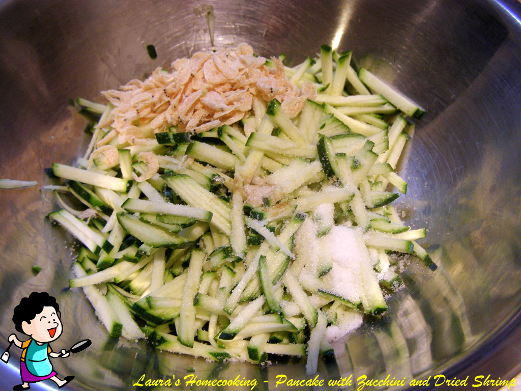 2. Mix dried shrimp and seasoning with zuchinni. For seasoning, I used salt, sugar and white pepper powder. Dried shrimp is pretty salty, so be careful on how much salt you put in. 3. Let the zuchinni mix sitting for several minutes.