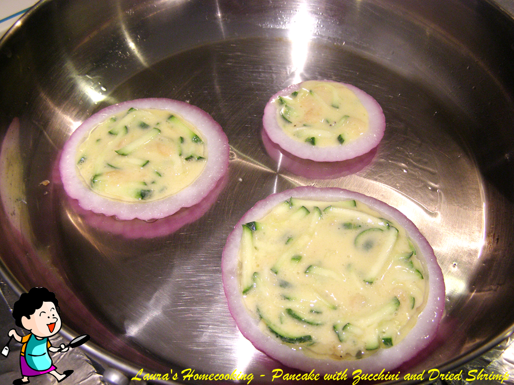 5. Add flour into zuchinni mix, then mix well. Make sure the batter is not too thick. Add water if needed. 6. Slice onion, then break onion slice into onion ring. 7. Heat up skillet, add cooking oil, adjust heat to medium high, put onion ring in skillet. 8. Scoop batter into onion ring, flip when the botton side turn lightly brown. 9. Serve hot when both sides turn lightly brown. You can serve with some dipping sauce. I normally would serve with some vinegar, or mix vinegar, soybean sauce and sesame oil.