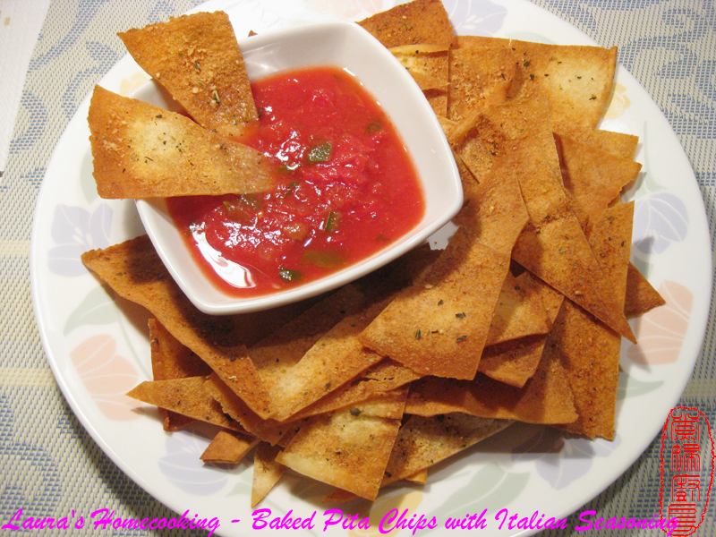 Method: 1. Cut each pita bread into 6-8 wedges, then tear the wedges apart to make pita chips single sided if pita bread is double sided. 2. Mix the rest of ingredients, brush on the non-finished side of each wedge. 3. Preheat oven to 400 degree. 4. Bake pita chips for about 7 minutes or until chips get golden brown. Chips will get burnt up really quick, so you might want to watch when time's getting close. 5. Transfer to wired rack to cool.