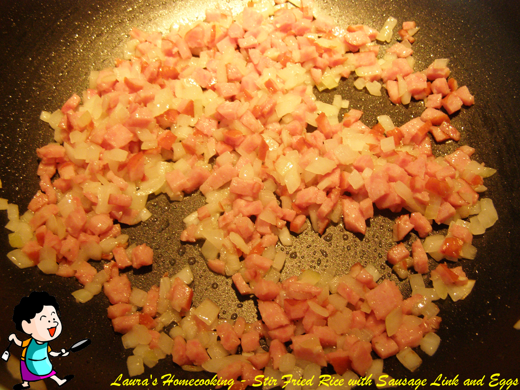 1. Chop onion, green onion and sausage link into little pieces. 2. Pour a little tiny bit cooking wine in bowl, then mix with eggs, beat well.