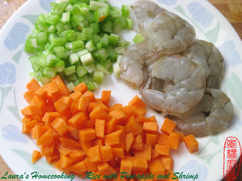 3. Chop some of the pineapple. Set the rest of it aside. 4. Beat eggs ( I used two eggs.) 5. Clean shrimps, rinse with running water, then transfer to 6. Heatup cooking oil in saute pan, cook eggs into little pieces, then add vegetables, then shrimp. Transfer to plate for future use. 7. Heatup some cooking oil again, cook rice to hot, then add the vegetable mix to pan, add seasoning to taste. 8. Add pineapple to pan, stir evenly.