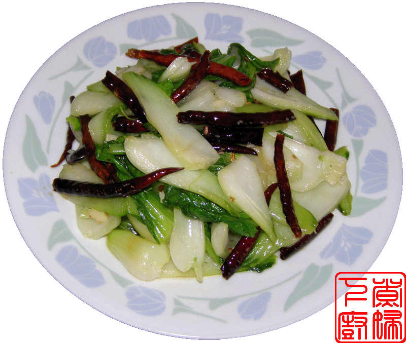 材料: 上海青,干辣椒,蒜,花椒粒,调味料。