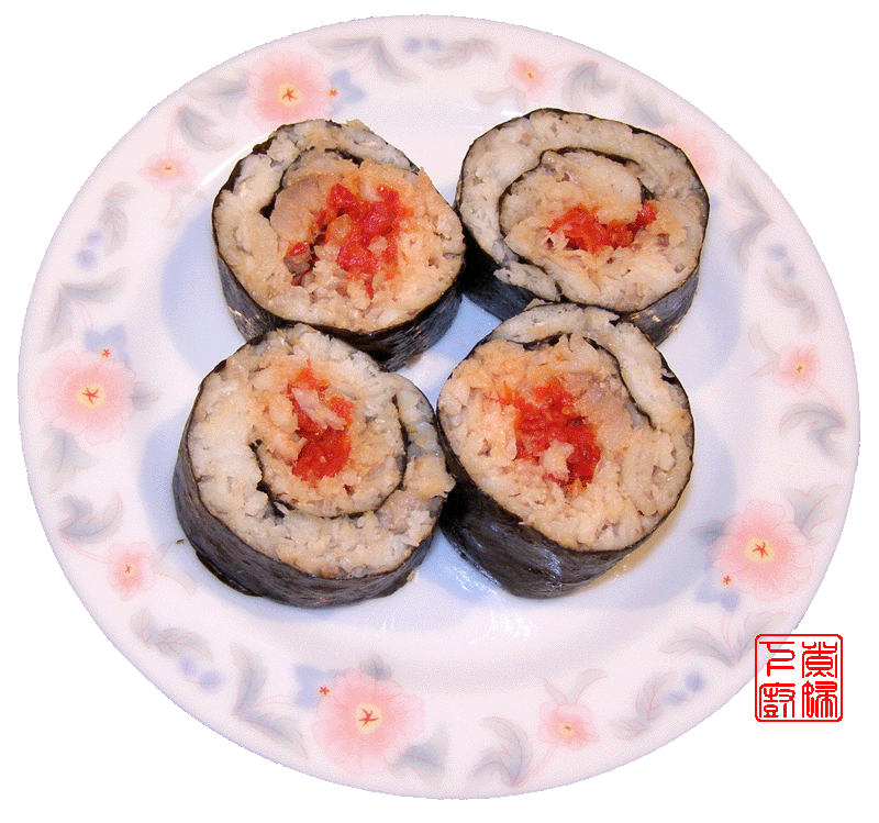 做法: 1、葱切段,姜切片,蒜拍散。 2、鱼肉用料酒、醋、盐和切好的葱姜蒜腌一会儿,然后开水上屉蒸熟。 3、蒸熟的鱼肉晾凉,然后弄碎。 4、在海苔上面均匀的铺上一层鱼肉,在一端留下一点空白,另一端在鱼肉上面铺一点辣椒酱,然后把海苔卷起来,从有辣椒酱的一端卷起来。 5、卷好之后把海苔的尾端朝下,稍微放置几分钟,然后用快刀切成长短均匀的段,摆盘即可。 因为辣椒酱里面有汁水,所以辣椒酱附近的鱼肉都被染的有点红色,好像比较影响卖相,所以不推荐使用。 也许辣椒酱不卷在海苔里面,而是切好之后浇在鱼肉卷上面会比较好看。