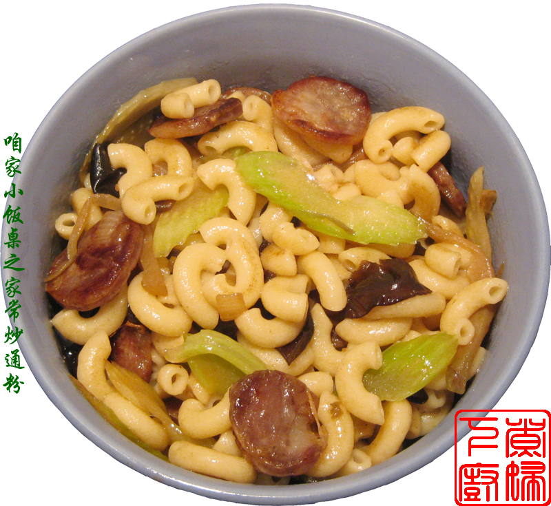 材料: 通心粉,香肠,芹菜,洋葱,榨菜丝,木耳,调味料。