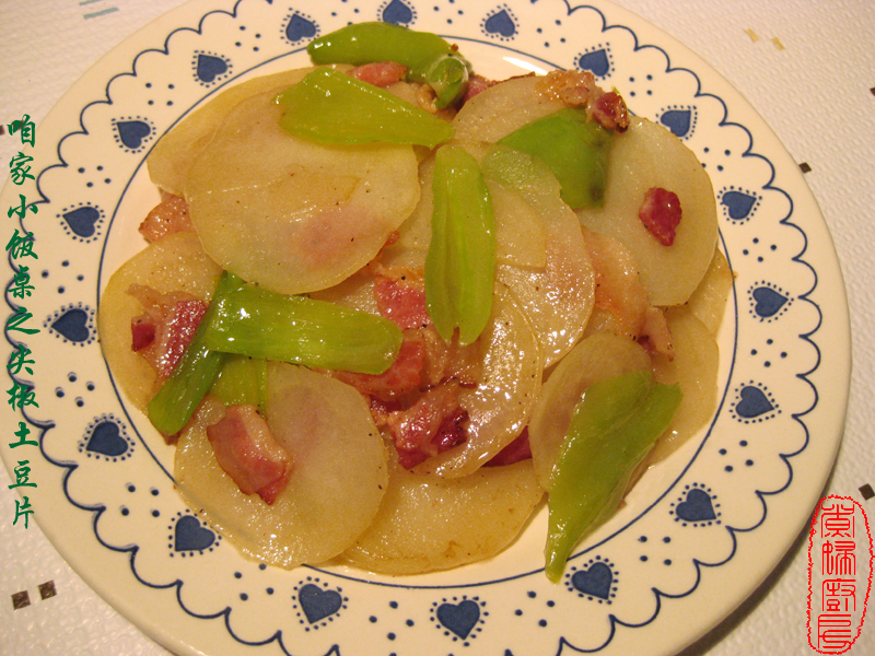 做法: 1、土豆削皮切(刨)片。 2、小辣椒切滚刀块。 切的时候沿中心的籽切,这样切好的辣椒基本就是不带籽的。 3、培根切片(块),大小随意。 4、炒锅烧热,不用倒油。把培根倒进锅炒至培根开始变色,出的油足够炒好整道菜。 5、培根盛出待用。 6、小辣椒和土豆片一起倒进锅煸炒,等土豆变色,加盐和胡椒粉调味,炒匀。 7、把培根倒进锅一起煸炒,到土豆完全成熟即可出锅。
