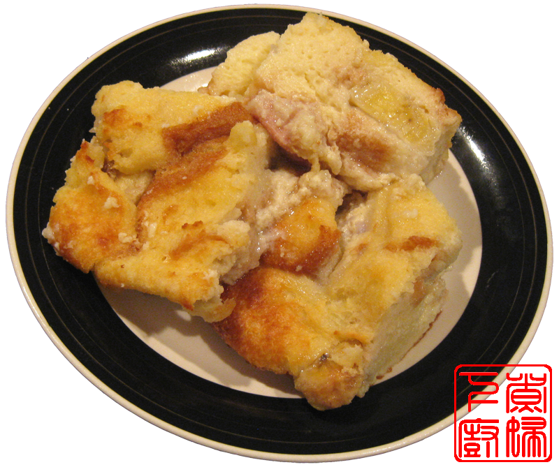 材料: 面包 10 oz,熟香蕉 4 根,鸡蛋 4 个,牛奶 3 杯,白糖 1/3 杯,黄油 1/8 杯加适量(刷烤盘用)。