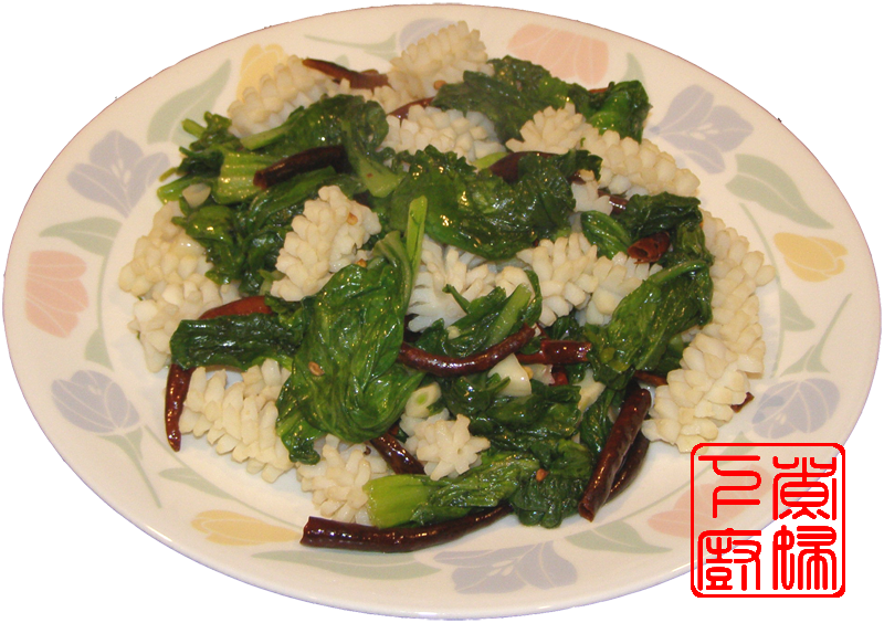 油菜叶,鱿鱼卷,干辣椒,蒜,调味料。