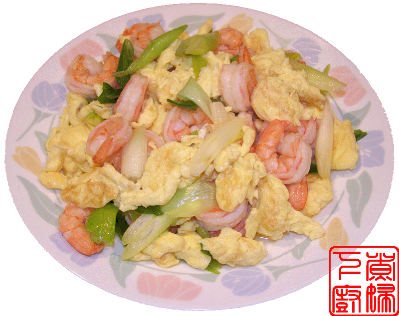 材料: 虾仁,鸡蛋,小葱,调味料。