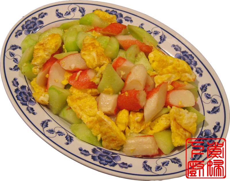 4、 炒锅倒油烧热,把蟹肉棒和黄瓜一起倒进锅略翻,然后加入蛋块,加盐调味,翻匀即可出锅。
