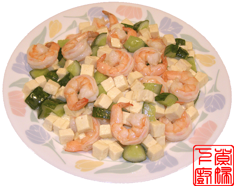4、炒锅倒油烧热,把黄瓜略微炒一下,然后放入豆腐继续翻炒,然后再放虾仁进去翻炒,等虾仁开始变色,按自己的口味调味,然后再加水淀粉勾芡即可出锅。