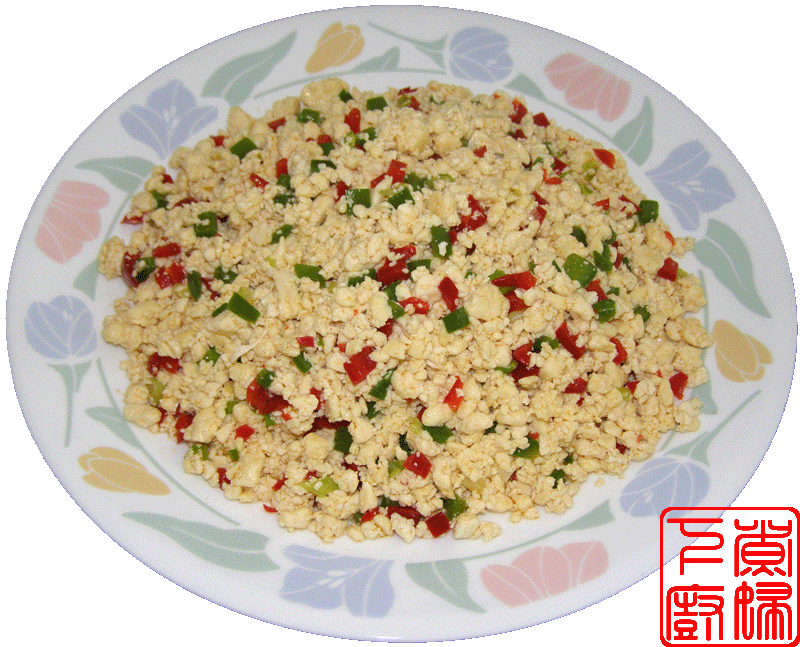 做法: 1、咸蛋白打散。 2、豆腐捏碎,和咸蛋白混匀。 3、小葱切葱花。 4、炒锅倒油烧热,把混好的豆腐放进锅大火翻炒,直到豆腐成颗粒状。 5、把辣椒碎倒进锅继续翻炒一会儿,然后加入葱花炒到葱花略软,用水淀粉勾芡,淋一点香油即可出锅。 因为用的是腌过的辣椒,多少带了一点腌汁进锅,所以豆腐炒过之后有一点微微发红。