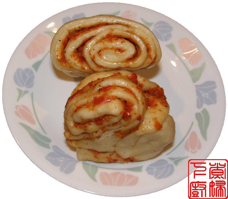 做法: 1、酵母加上等量的白糖,用温水化开,静置 10 分钟左右,或者直到酵母液表面充满气泡。 2、面粉倒入酵母液中,再适量加入温水,和成软面团,静置到面团发起到原来的两倍大。 3、发好的面团重新揉过,擀成一个长方的薄面片。 4、面片上面撒上适量的盐和黑胡椒粉,用擀面杖略微擀实一些,然后抹上一层辣椒酱。 5、把面片从一边卷起来,成为长条的面卷,然后用刀切成长短相同的段。 6、辣椒酱卷生坯略微静置一会儿,开水上屉,蒸 20 分钟左右,或至花卷成熟。 本来发面的生坯要多饧一会儿才上屉的,不过,辣椒酱里面水分多,我怕饧的时间久了花卷就被那些水分泡糊了,所以只略微饧了一下就蒸了。