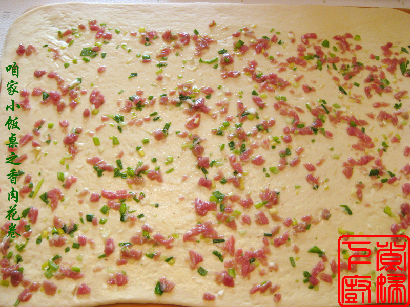 1、酵母和等量白糖混匀,用温水化开,静置几分钟,让酵母液表面充满气泡。 2、面粉和酵母液混合,再加适量温水和成较软的面团,饧发到面团为原来的两倍大。 4、小葱切碎葱花,用盐腌几分钟。 5、肉丝、葱花和五香粉、油一起拌匀。 6、饧好的面团揉匀,擀成一张大面片。