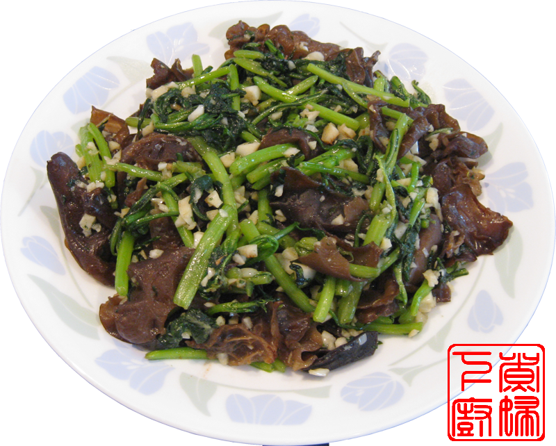 4、炒锅倒油烧热,先炒一会儿木耳,然后把茼蒿放进锅略炒,再把蒜末也放进锅爆香,加盐调味,翻匀即可。