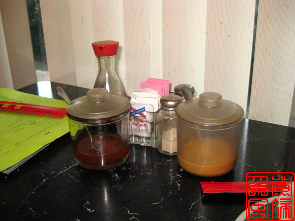 逛了一圈回来,菜还没上来。实在是无聊,就给调料来了个特写。