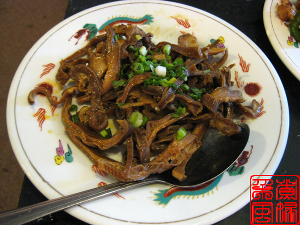 凉拌猪肚有点让人失望。猪肚是卤的,卤的倒是很够火候,味道都进去了,可惜有些甜,不合我的胃口,而且不怎么吃得出是猪肚。要是闭着眼睛吃,估计我会说是香干,嘿嘿。