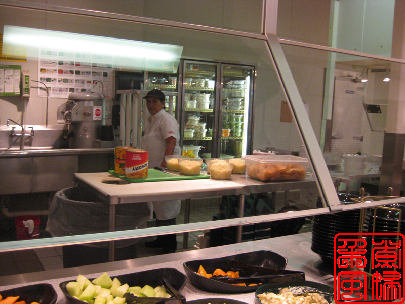 主食区那里专门有一个人在那里煎肉排和排骨,沙拉区那里也有专人负责随时补充食物。