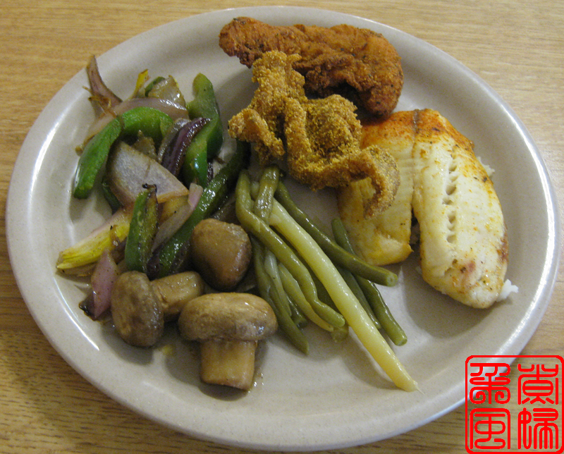 主食区大多就是大块的肉和一些煮的蔬菜。盘子里面有两种煮的豆角(四季豆),还有煮的萝卜缨(叶),炒的蘑菇,炒的柿子椒和洋葱,还有炸鸡腿,炸鸡胸、炸鱼、煎鱼,还有炖猪肉,餐包。