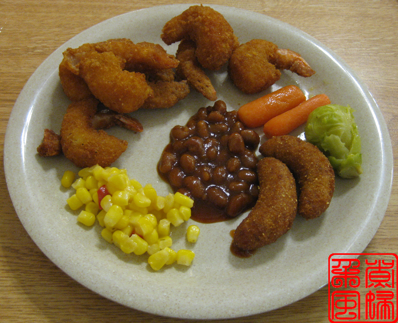 猪排,猪肉派, 炸虾的面皮太厚了,我是剥了面皮吃虾来的。炸玉米粉团味道还将就。