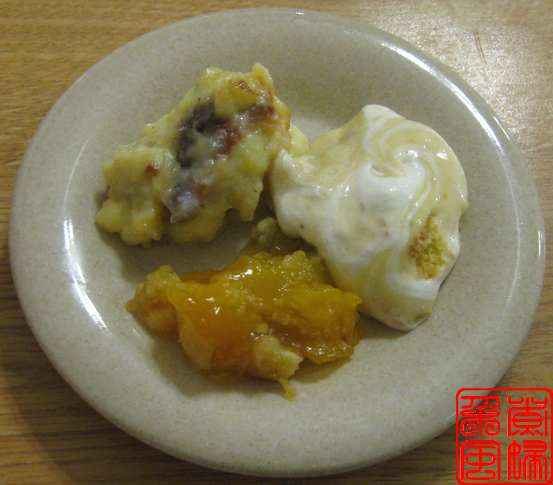 香蕉布丁一向是我的最爱,黄桃派的味道也可以,面包布丁还凑合,米花糖也凑合,其他两样带巧克力的,我只尝了一口就放弃了。