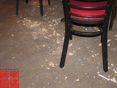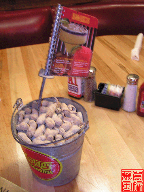在车上,决定去这家餐馆的时候,就听同事们讲花生什么的,听得我一头雾水,到了店里,才算明白过来他们在说什么。原来这家餐馆的每张餐桌上面都有一个小桶, 桶里面是烤熟的花生,给人做零食的。出来的时候,我才看到,原来一进门的地方,还有一个大大的花生桶立在地上。不过,用餐的客人都把花生皮直接丢在地上,这个就让人不敢恭维了。