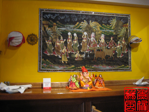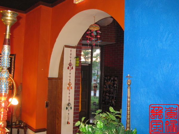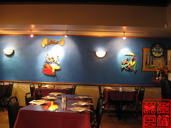 这家餐馆之前是一家墨西哥餐馆,应该是有两个入口。店老板封了其中的一个入口,把原本的走廊变成了一个小休息厅,里面还有不少印度味道的摆设。