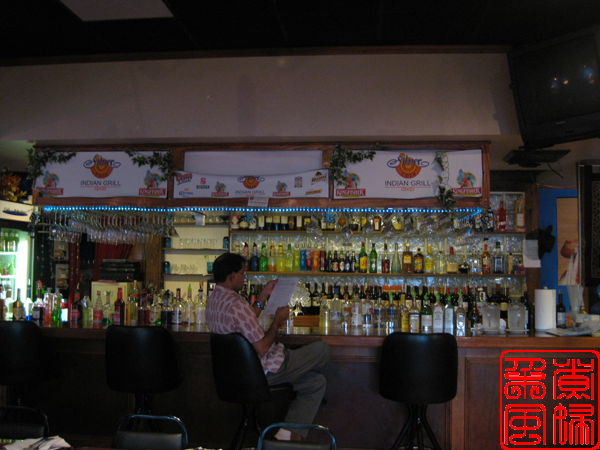 左侧是栏起来的用餐区,还有一个卖酒的吧台。围栏有半人多高,上面 摆了一些印度风味的东西。