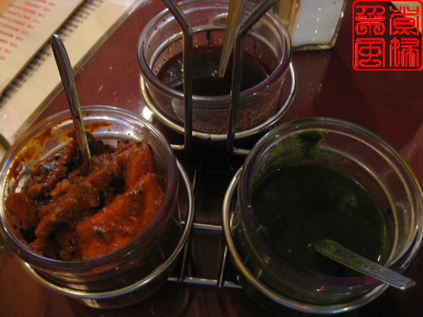 还会给你拿来这么一套调味汁和小菜。小菜就是用胡萝卜什么腌的,很辣,很直接的辣,不过没什么后劲。 绿色的那种,有些韭菜花的味道,不过还添加了其他的香料。红色的那种是纯液体的,有点辣,还有些甜,味道不错,这些酱汁都可以拿来配那些酥片,还有他们的馕什么的。
