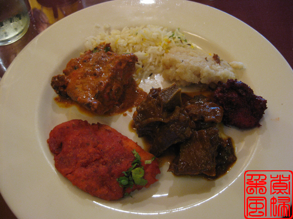 黑乎乎的是咖喱羊肉,红灿灿的是炸鱼,黄的是咖 喱鸡肉,米饭和羊肉之间的就是那个甜东西,好象是面加上土豆泥什么的做的。