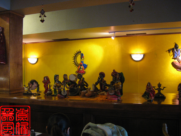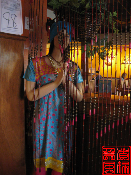 进去之后,是一个小走廊,右侧是一个柜台,带位小姐的天下,柜台过去是印度地图,还有掩在珠帘后面的真人大小的印度人雕塑。