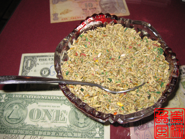 柜台上是一块玻璃板,下面压着几张印度的纸币。上面摆着一个小碗,碗里的是些香料种子,带位小姐说是给人吃完饭清嘴巴里面的味道用的。